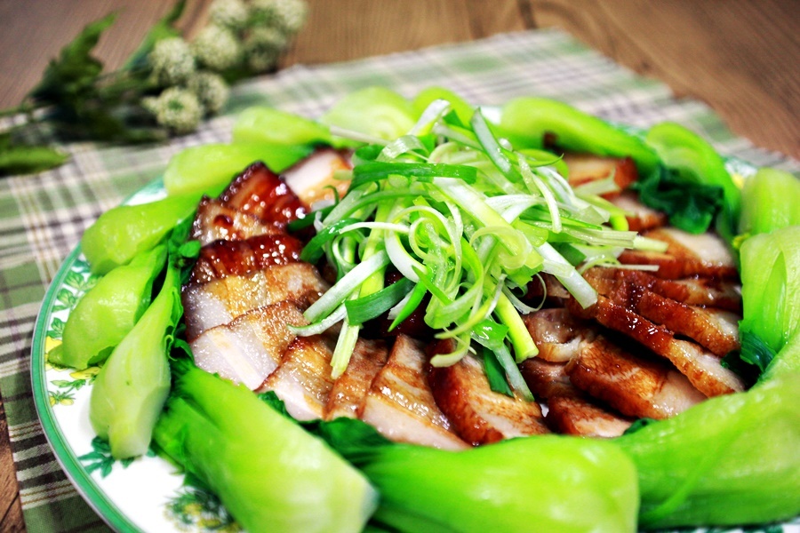 조리된 동파육을 썰어 접시에 예쁘게 담아줍니다. 데친 청경채와 다진 파와 고추를 고명으로 올리면 완성입니다!