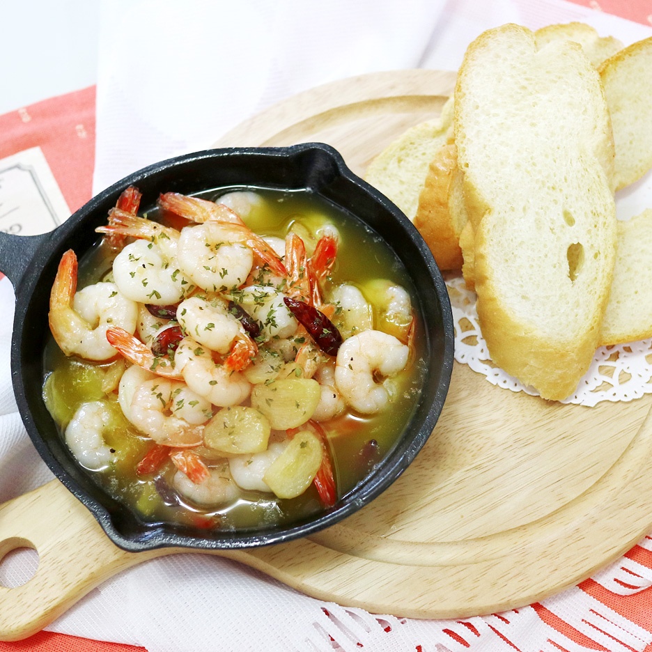 - 완성된 감바스는 뜨거운 상태에서 바게트와 함께 서빙합니다.