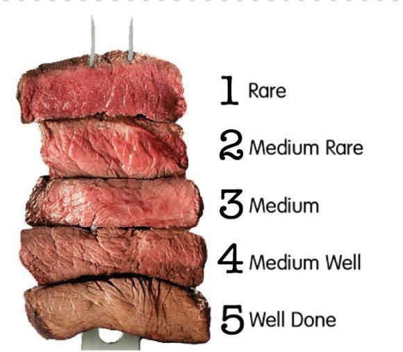 스테이크의 굽기 정도는 일반적으로 다음과 같은 심부 온도로 구분됩니다: